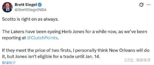 上赛季后半段以来,湖人队一直保持着良好的势头,在季后赛中再次成为强队。但想要进入冠军争夺,显然没那么容易。一方面,湖人队需要对阵容进行调整和升级。另外,除了雷霆之外,西部其他球队战绩都很紧张,容错率似乎很低。据记者布雷特·西格尔报道,湖人队正在正式追逐赫伯特·琼斯。该消息此前由 Michael Scotto 报道过,现在也算是得到了证实。不过,对手鹈鹕队的胃口却很大。据说除了合同平等之外,他们还要求至少两个首轮选秀权,这可以吓到湖人队和其他球队。赫伯特·琼斯是整个联盟首屈一指的防守专家。本赛季,他场均贡献9.6分、3.8个篮板、2.2次助攻和1.4次抢断。而且,即使是虽然鹈鹕的空间很小,但他的三分命中率也达到了联盟平均水平。赫伯特·琼斯的官方身高约为1.98米,但他拥有出色的臂展和机动性,因此可以在场上防守1-4号位,这是一个非常难得的数值。众所周知,湖人队不缺进攻点,但他们需要顶级的防守工程师。如果他们得到赫伯特琼斯,可以直接弥补球队的一大短板。至于鹈鹕的要价,说实话,不用太在意。卖方的初始要价应该较高,以便为进一步谈判留出空间。与此同时,湖人队在面对弱旅爵士队时可能会缺少三名轮换球员。奥斯汀·里维斯小腿受伤,并且已经在大名单上待了很长时间,所以无需详细说明。比较困难的是首发中锋艾顿。由于肘部疼痛,他无法参加比赛。众所周知,本赛季失去艾顿,导致湖人队的进攻陷入困境。有效性下降。即使赢得比赛也要经历很多困难。剩下的球员是替补后卫文森特。自从加盟湖人队以来,他似乎就在伤病名单上。好在湖人这个位置还有东契奇和斯玛特,所以球员并不算太缺。当然,说到伤病,对对方爵士队的影响可能比湖人队更大。作为核心球员,马尔卡宁现在因腹股沟拉伤而出战成疑。如果马尔卡宁缺阵或者发挥不佳,对于爵士队的进攻端将会产生不小的影响。此外,凯斯勒、尼昂和哈克莱斯都确认因伤缺阵,而希布韦则被送往发展联盟。要知道,赛季才刚刚开始两个月,各支球队都各自面临着人员短缺的问题。未来这种情况可能会变得更加夸张。