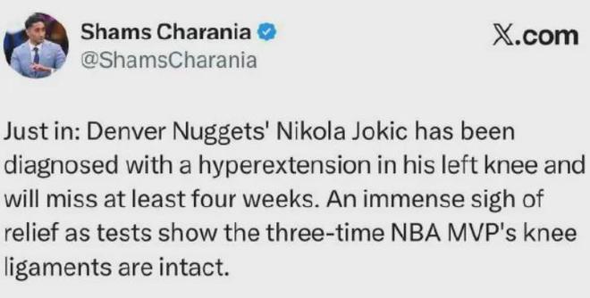就在这里,等待就在这里。举报人沙姆斯:约基奇的膝盖过度伸展,韧带完好,但他将不得不缺席至少四个星期。本赛季至今,约基奇出战32场比赛,场均上场34.6分钟,得到29.6分12.2篮板11助攻。他的投篮命中率高达60.5%,带领掘金队以22胜10负暂时排名西部第三。或许大家还在担心约基奇本赛季能否打满65场比赛?因为这是评选MVP和最佳阵容的严格条件。从2031年12月25日到31年1月26日,掘金队将打18场比赛。如果约基奇全部休息,本赛季的出场数将不足65场。虽然最乐观的结果是他可以在明年1月30日重返赛场,但接下来1月31日的拉罗尔必须背靠背。如果他们背靠背比赛,他们需要保持全勤才能达到正好65场比赛。此外,正如 ab 提到的至少是停顿了四个星期,并不意味着只会消失四个星期。著名记者西格尔表示,约基奇可能会缺席 6-8 周。总之,基本确定了约基奇本赛季拿不到职业生涯第四座MVP奖杯,但场均三双的数据却令人遗憾。体育预测平台Polymarket更新了球员当选本赛季常规赛MVP的赔率。亚历山大以80%位居榜首,东契奇以10%位居第二,约基奇以9%位居第三。在约基奇受伤之前,他在最新一期的NBA官方MVP榜单上排名第一。也许随着年龄的增长,会出现损伤问题。 30岁的约基奇除了本赛季之前的22-23赛季外,每个赛季都打了70场或以上的比赛。 NBA生涯至今常规赛出勤率高达92.3%(842-777)。值得一提的是,约基奇受伤之前,戈登(右腿筋拉伤)、布劳恩(左脚踝扭伤)和乔恩森(右膝挫伤)受伤,这意味着穆雷是掘金首发五人中唯一还能上场的人了……重伤无法阻止。