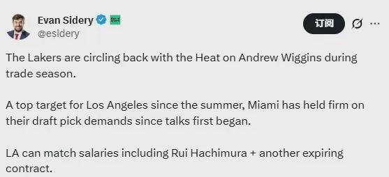 著名记者西德里:湖人与热火重启维金斯交易谈判……今年9月,湖人准备送出24届选秀首轮17号秀克内克特换来维金斯,但热火坚持要求以未来不受保护的首轮选秀权作为回报,因此交易谈判自此陷入停滞。本赛季至今,30岁的维金斯场均贡献15.9分4.8篮板2.9助攻1抢断1.1盖帽,投篮命中率47.1%,场均以37.9%的命中率投进1.7个三分球。目前合同于2027年夏天到期,本赛季薪资为2822万美元,下赛季薪资为3017万美元。目前热火队以16胜15负排名东部第八。至于湖人队,目前以19胜10负排在西部第四位,仅领先第七名太阳队2.5个胜场。他们的防守问题很糟糕自赛季开始以来。到目前为止,他们场均得分117.4分排在联盟第19位,防守效率118.1排在联盟第26位等等。因此,湖人队渴望长期守住大门,而作为联盟中著名的攻防侧翼,哥哥作为勇士核心拥有高水平的赢球经验,为夺冠经验做出了贡献。 2022年。显然,这对紫金军来说是最合适的。不幸的是,热火管理层并没有轻易被愚弄,他们可能不得不为首轮选秀权付出代价。美媒很早就给出了一定的交易方案,如下:湖人队收购维金斯;热火得到鲁伊·哈奇奇普(1826万美元,合同年)+克内克特(401万美元)+1个首轮选秀权。除了维金斯之外,湖人队还在寻求鹈鹕队的侧翼琼斯(1394万美元)。不过后者要价更高,据说有两张首轮照片ks。这个男人今年27岁。本赛季至今,他场均贡献9.8分、3.7个篮板、2.4次助攻和1.7次抢断。他场均投进1.4个三分球,命中率为34.4%。他去年入选NBA最佳防守阵容。 NBA 25-26赛季的交易截止日期为北京时间明年2月6日。在此之前我们能期待湖人队能掀起怎样的波澜呢?